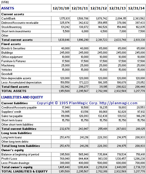The projected balance sheets (3 years monthly - not shown here, and 5 years annual) are fully automated in PlanMagic Business.